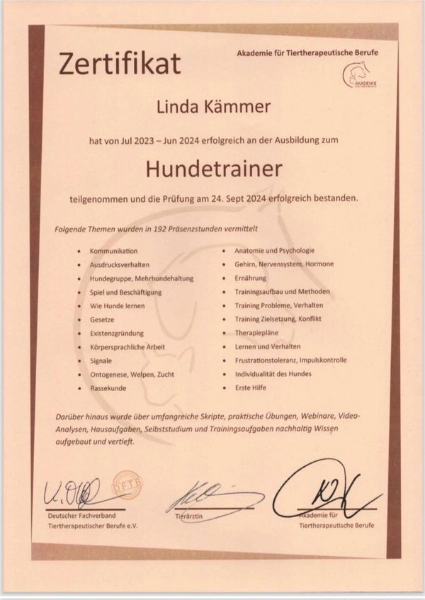 Nach meiner erfolgreich abgeschlossenen Hundetrainer-Ausbildung bei Mirjam Cordt (Dog-InForm), im Jahre 2022, bin ich auch als Verhaltensberaterin am Start.