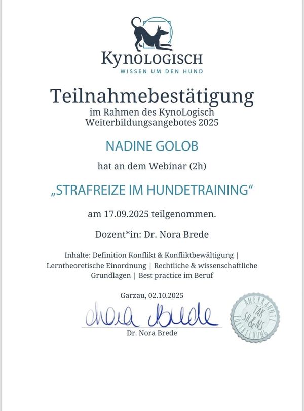 Meine Mitarbeiter und ich, Nadine, spezialisiert auf Angsthunde/Angstverhalten, bilden uns stetig fort, u.a. im Bereich Tierschutzhunde, Hundeverhalten, Hundetraining, uvm.